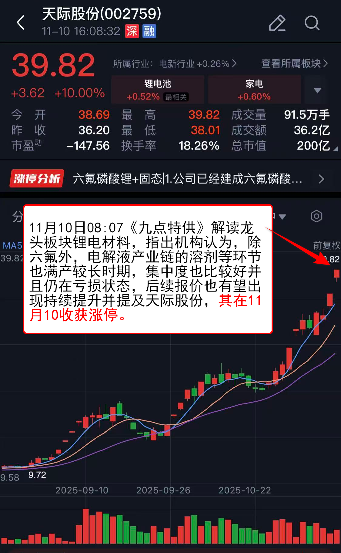 11月10日08:07《九点特供》解读龙头板块锂电材料,指出机构认为,除六氟外,电解液产业链的溶剂等环节也满产较长时期,集中度也比较好并且仍在亏损状态,后续报价也有望出现持续提升并提及天际股份,其在11月10收获涨停。