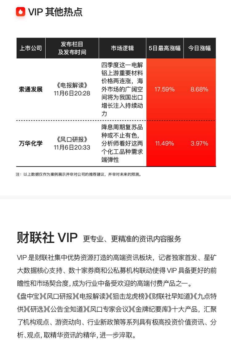 注:财联社VIP为内容资讯产品,并非投资建议。以下内容仅为资讯价值展示非对相关公司的推荐建议,非未来走势预测。投资有风险,入市需谨慎。