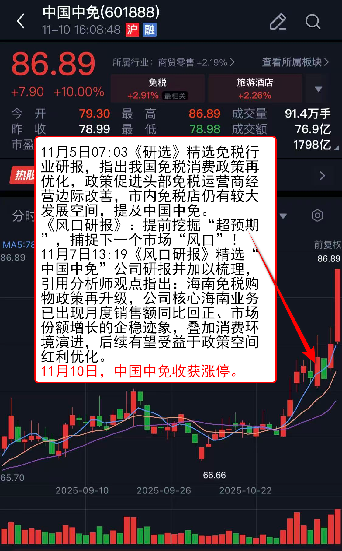 11月10日,中国中免收获涨停。