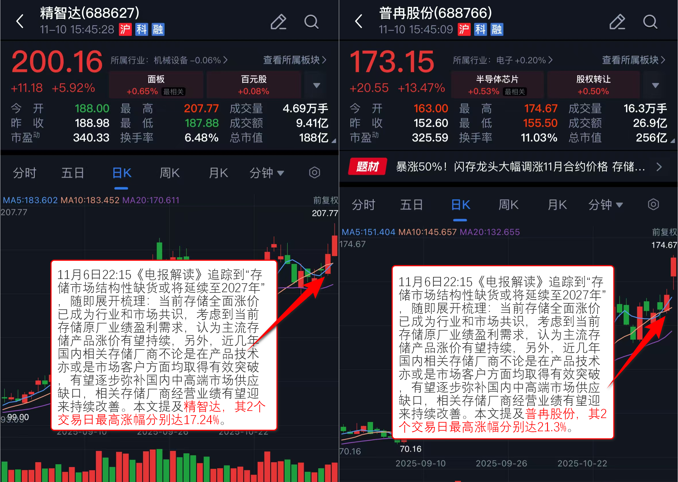 11月6日22:15《电报解读》追踪到“存储市场结构性缺货或将延续至2027年”,随即展开梳理:当前存储全面涨价已成为行业和市场共识,考虑到当前存储原厂业绩盈利需求,认为主流存储产品涨价有望持续,另外,近几年国内相关存储厂商不论是在产品技术亦或是市场客户方面均取得有效突破,有望逐步弥补国内中高端市场供应缺口,相关存储厂商经营业绩有望迎来持续改善。本文提及普冉股份、精智达,其2个交易日最高涨幅分别达21.3%、17.24%。