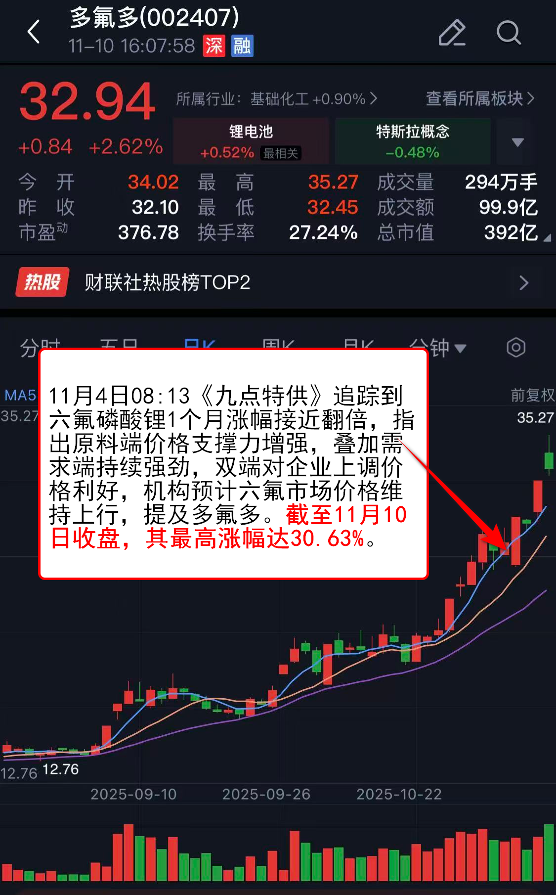 11月4日08:13《九点特供》追踪到六氟磷酸锂1个月涨幅接近翻倍,指出原料端价格支撑力增强,叠加需求端持续强劲,双端对企业上调价格利好,机构预计六氟市场价格维持上行,提及多氟多。截至11月10日收盘,其最高涨幅达30.63%。