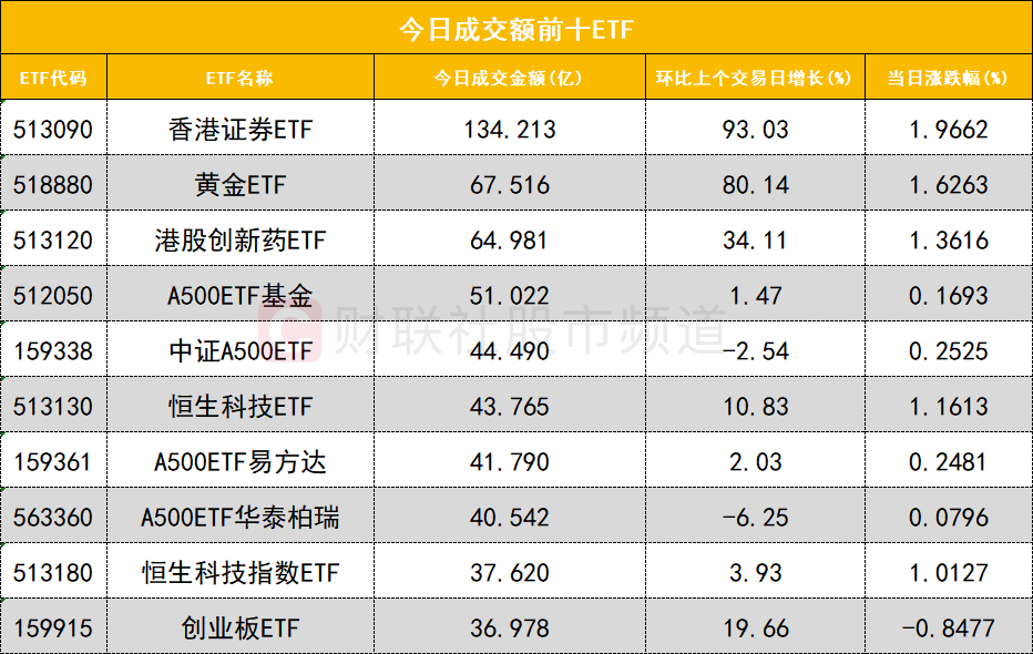 从成交额前十的ETF来看,香港证券ETF(513090)成交额位居首位,黄金ETF(518880)成交额位居次席。