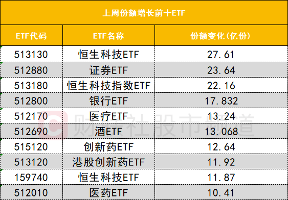 在上周份额增长前十ETF中,恒生科技ETF(513130)上周份额增长27.61亿份位居首位。在上周份额增加前十的ETF中,多只医药相关ETF份额大幅增加,其中创新药ETF(515120)上周份额大幅增加12.64亿份位居首位。此外,港股创新药ETF(513120)、医药ETF(512010)、医疗ETF(512170)份额均大幅增加。
