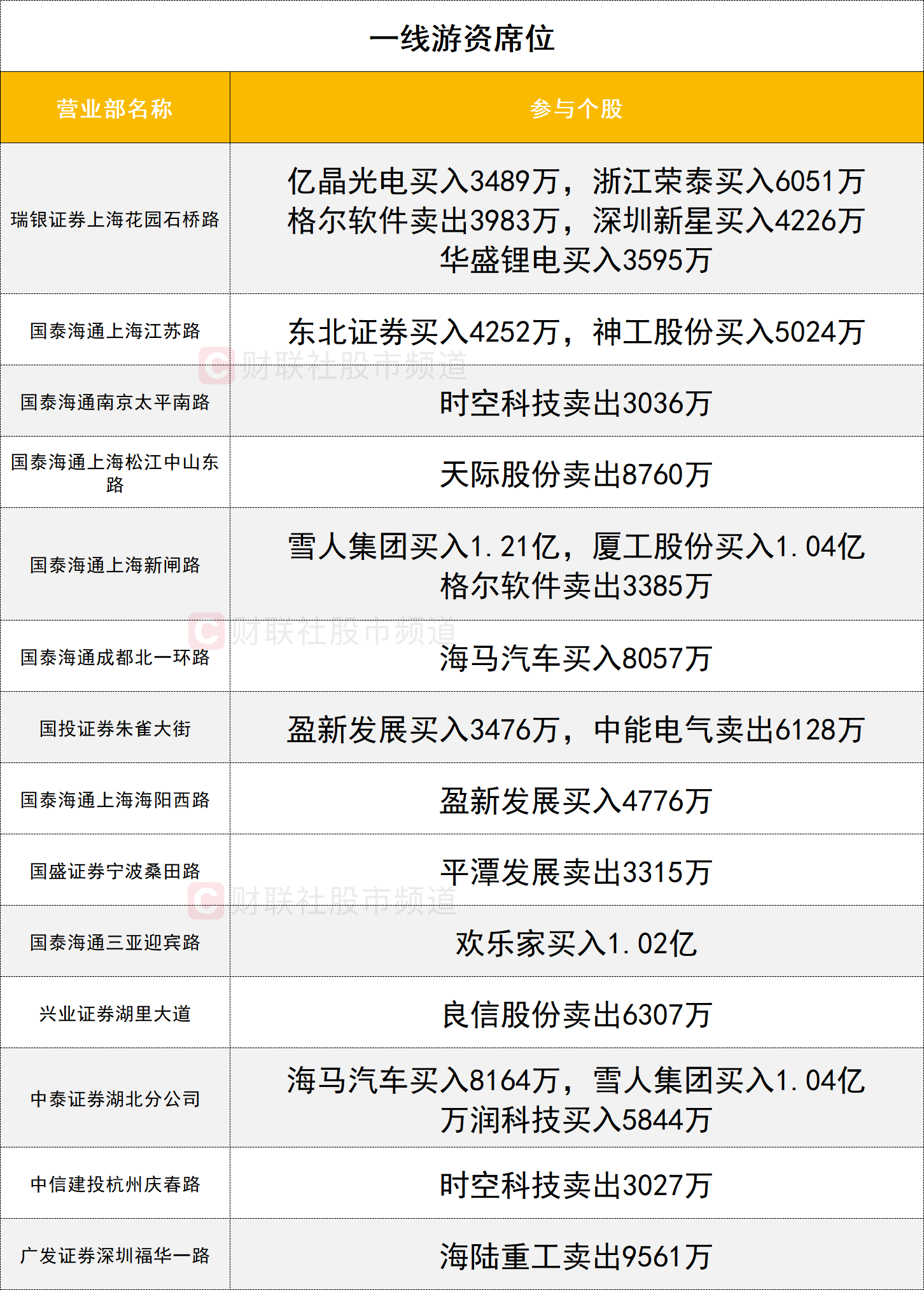 一线游资活跃度较高,天际股份遭一家一线游资席位(国泰海通证券上海中山东路)卖出8760万。雪人集团获两家一线游资(国泰海通上海新闸路、中泰证券湖北分公司)合计买入2.25亿。