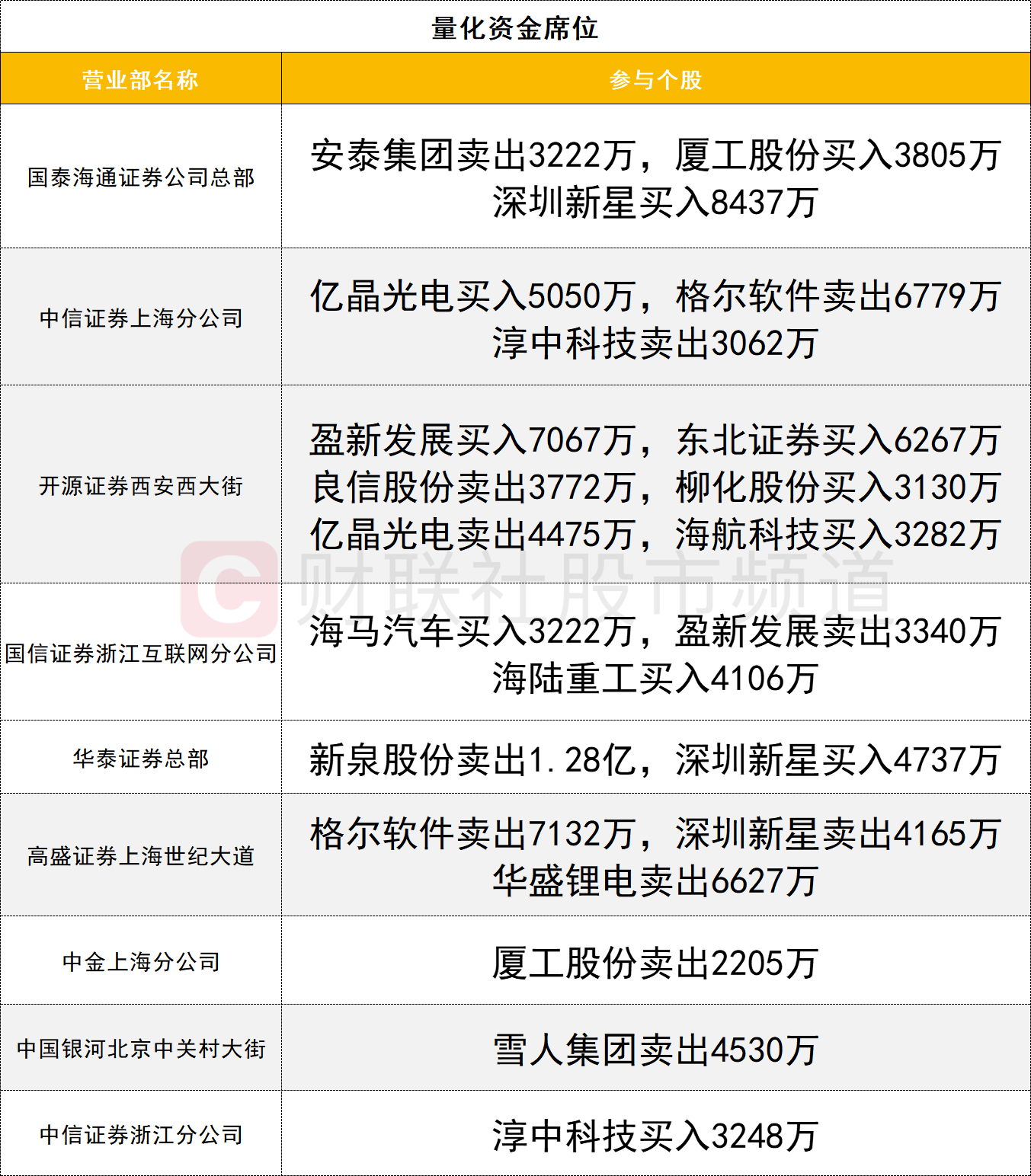 量化资金活跃度较高,新泉股份遭华泰证券总部卖出1.28亿。东北证券今日涨停,开源证券西安西大街席位买入6267万。