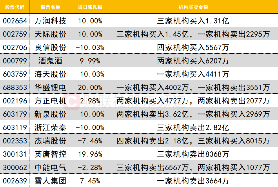 卖出方面,杰瑞股份遭四家机构卖出2.18亿,同时获三家机构买入8015万。机器人概念股浙江荣泰今日跌停,遭三家机构卖出2.82亿。