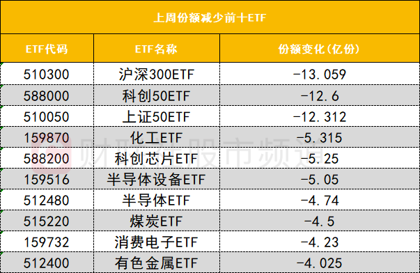在上周份额减少前十的ETF中,多只半导体相关ETF份额大幅减少,其中科创芯片ETF(588200)上周份额减少5.25亿份。