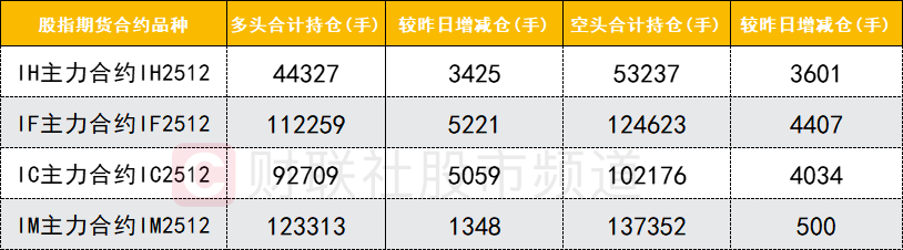 四大期指主力合约中,IH、IF、IC、IM合约多空双方均加仓,IF、IC、IM合约多头加仓数量较多。