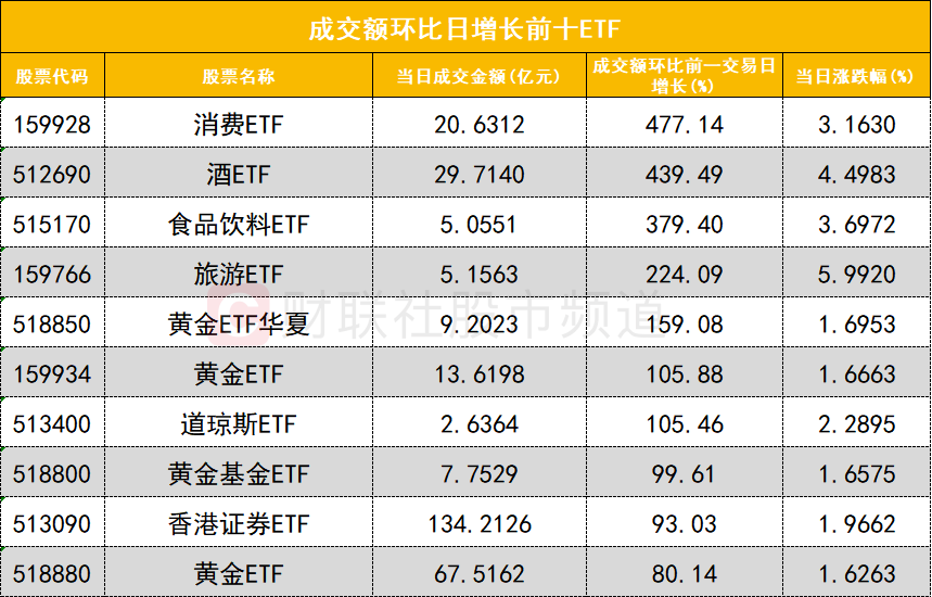 从成交额环比增长前十的ETF来看,消费ETF(159928)成交额环比增长477%位居首位;酒ETF(512690)成交额环比增长439%位居次席。