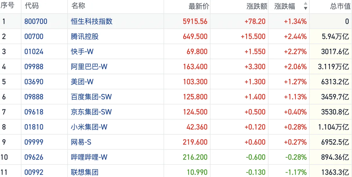 盘面上,今日大型科网股明显转涨,腾讯、快手、阿里巴巴涨超2%,百度、美团涨超1%,京东、小米、网易跟涨。