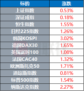 欧洲主要股指收盘集体上涨,欧洲斯托克50指数涨1.71%,英国富时100指数涨1.08%,法国CAC40指数涨1.32%,德国DAX30指数涨1.65%。