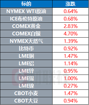 COMEX黄金期货收涨2.83%,报4123美元/盎司,COMEX白银期货收涨4.7%,报50.40美元/盎司。