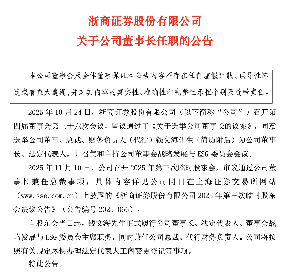 与吴承根的荣休相伴的,是“75后”少帅钱文海的正式上任。这场人事交接早有铺垫:2025年10月16日,浙商证券便公告收到实际控制人浙江省交通投资集团文件,因吴承根到龄退休,提名钱文海为董事长人选。