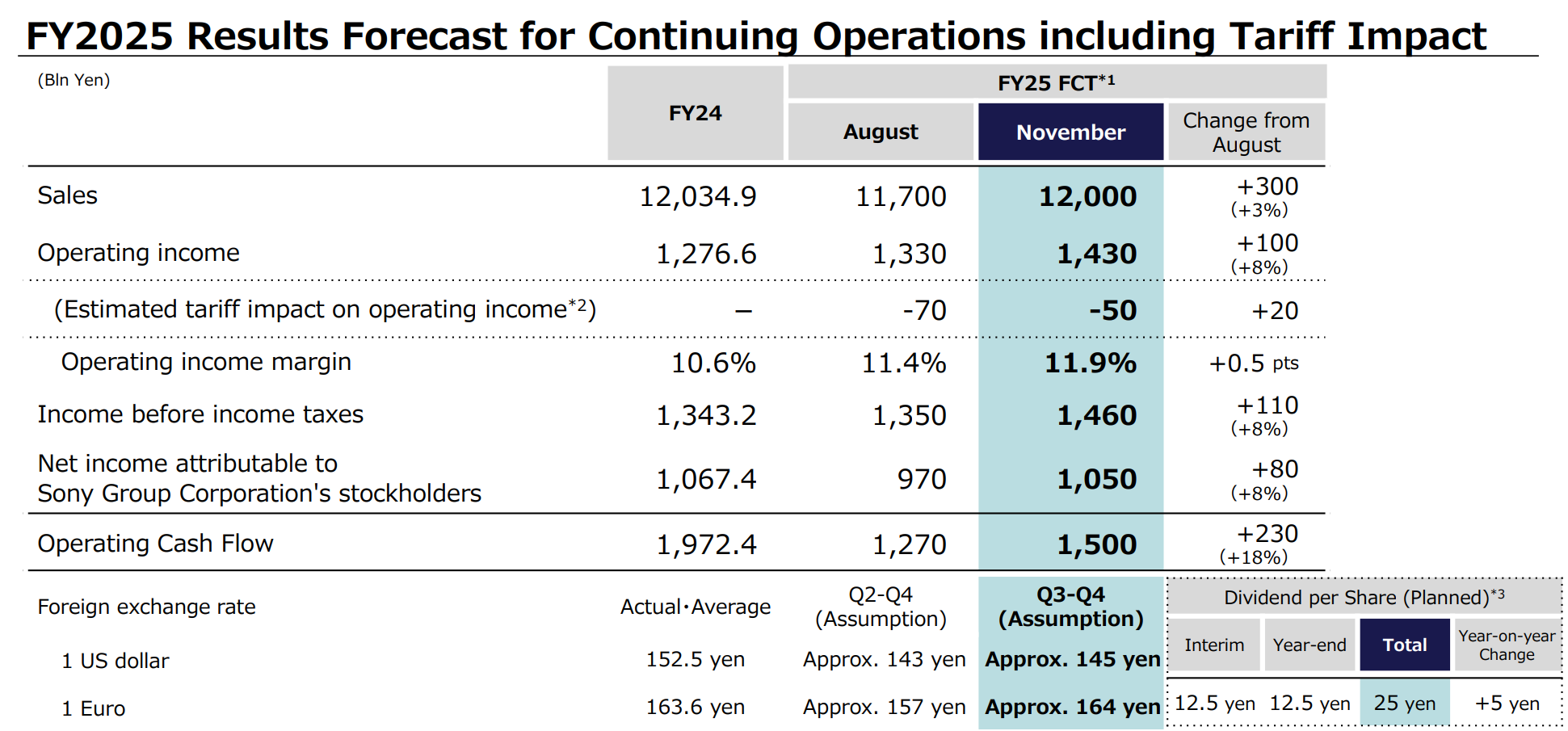 索尼也上调了截至明年3月的财年业绩指引。其中营业利润将达到1.43万亿日元,此前8月的预测为1.33万亿日元。销售额和净利润的预测也有所上升。