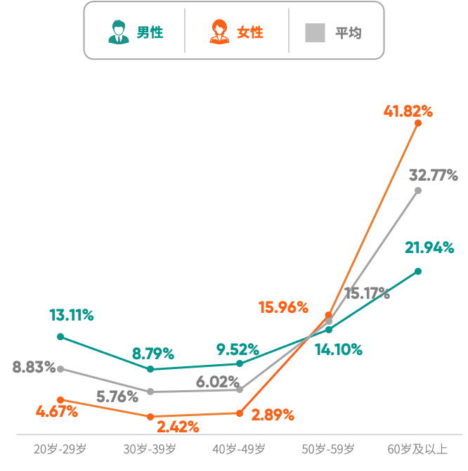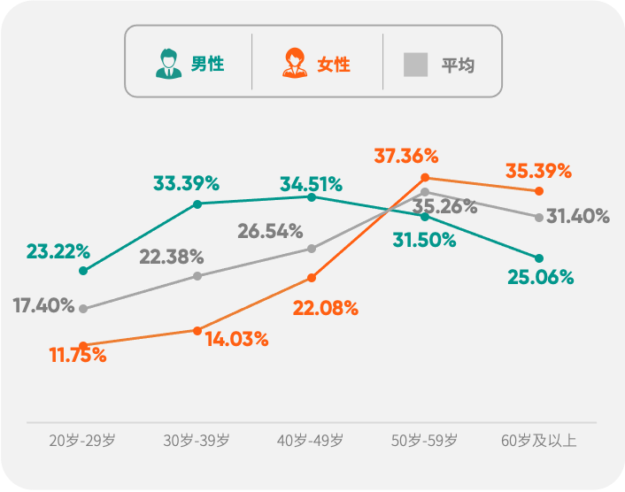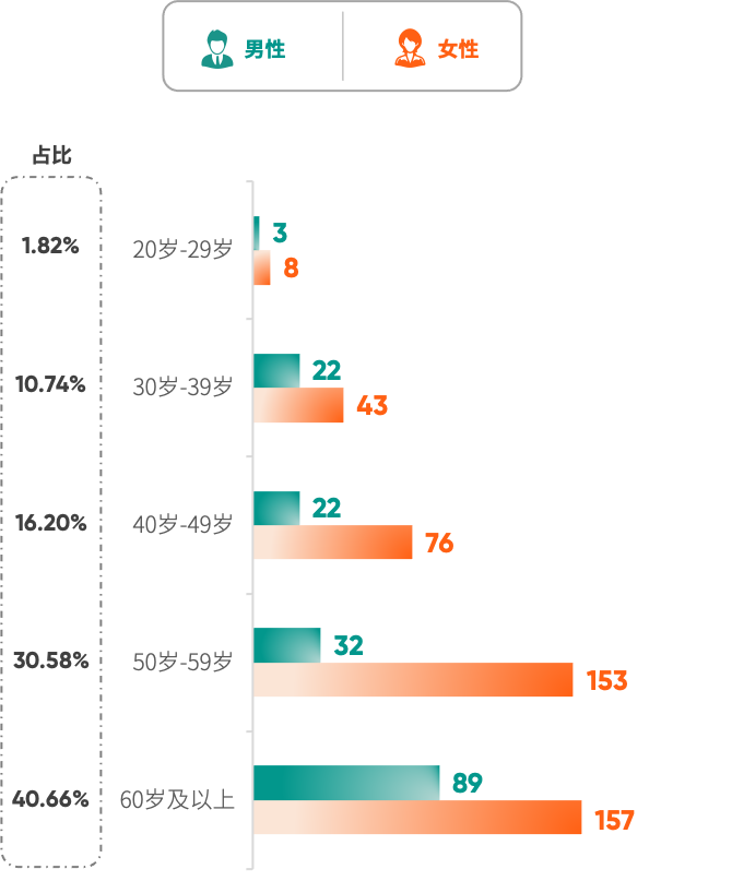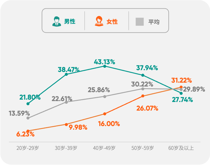 骨质疏松症已经成为我国50岁以上人群的重要健康问题,尤其多见于女性。从50岁开始,女性银行及保险高净值客户骨质疏松(骨密度)检出率高于男性,60岁及以上检出率超过41%,接近同年龄段男性的2倍,相当于每10人中,有超过4个人拥有“散装骨头”,与这一年龄段雌激素水平缺乏有关。