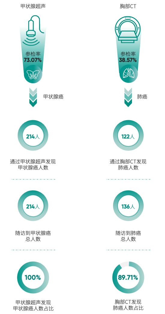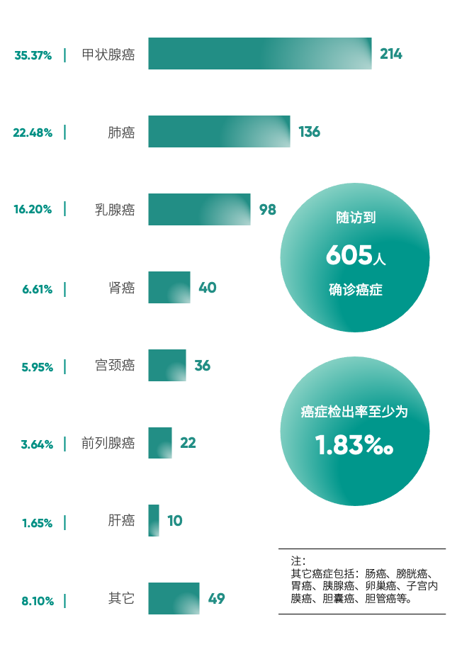 在随访到的癌症患者中,甲状腺癌确诊人数最多,高达214人,往下依次是肺癌、乳腺癌、肾癌、宫颈癌、前列腺癌及肝癌等。