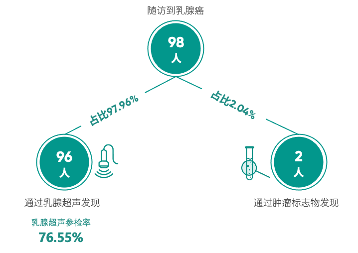 绿皮书显示,共随访到乳腺癌98人,其中96例通过乳腺超声检查发现(占比97.96%);2例通过肿瘤标志物检测发现(占比2.04%),所有乳腺癌患者均在临床确诊。值得注意的是,有2位是35岁-40岁女性。