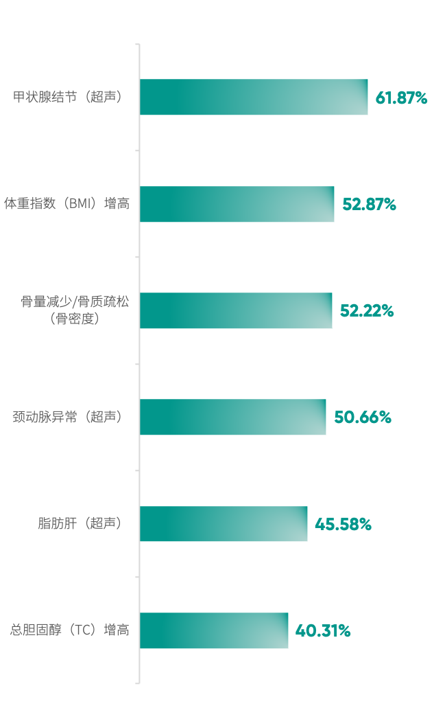 排除与性别相关的前列腺异常(超声)和乳腺结节(超声),甲状腺结节(超声)在银行及保险高净值客户中的检出率最高,达到61.87%,往下依次为体重指数(BMI)增高、骨量减少/骨质疏松(骨密度)、颈动脉异常(超声)、脂肪肝(超声)和总胆固醇(TC)增高,检出率均超过四成。