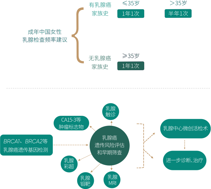 定期进行健康体检,是远离乳腺癌的重要措施。爱康建议:中国女性从35岁开始,乳腺检查频率建议一年一次;超过35岁且有乳腺癌家族史的女性,建议缩短到半年一次;如有BRCA基因突变的女性,则需要从18岁开始定期筛查。除触诊外,可结合乳腺超声、乳腺钼靶、乳腺磁共振MRI、肿瘤标志物等的针对性检查。