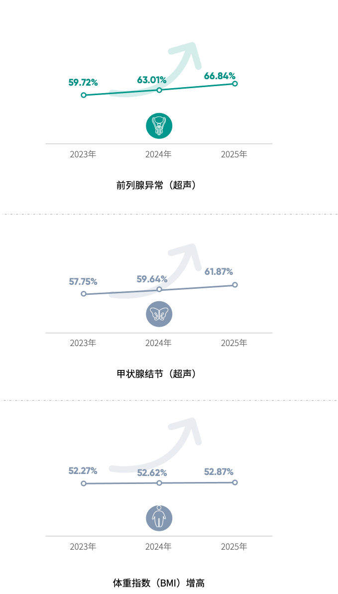 对比近三年体检异常结果,前列腺异常(超声)、甲状腺结节(超声)和体重指数(BMI)增高历年检出率均超过50%。此外,前列腺异常(超声)、乳腺结节(超声)、总胆固醇(TC)增高、甲状腺结节(超声)、颈动脉异常(超声)等11项异常结果连年走高;空腹血糖(FBG)升高、幽门螺杆菌检测(呼气试验)阳性和尿酸(UA)增高连续三年检出率有逐年下降趋势。