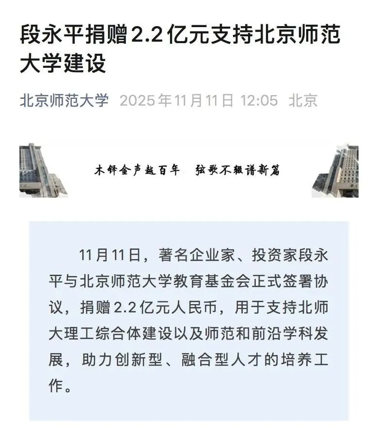 财联社11月11日讯,据北京师范大学微信公众号,11月11日,著名企业家、投资家段永平与北京师范大学教育基金会正式签署协议,捐赠2.2亿元人民币,用于支持北师大理工综合体建设以及师范和前沿学科发展,助力创新型、融合型人才的培养工作。