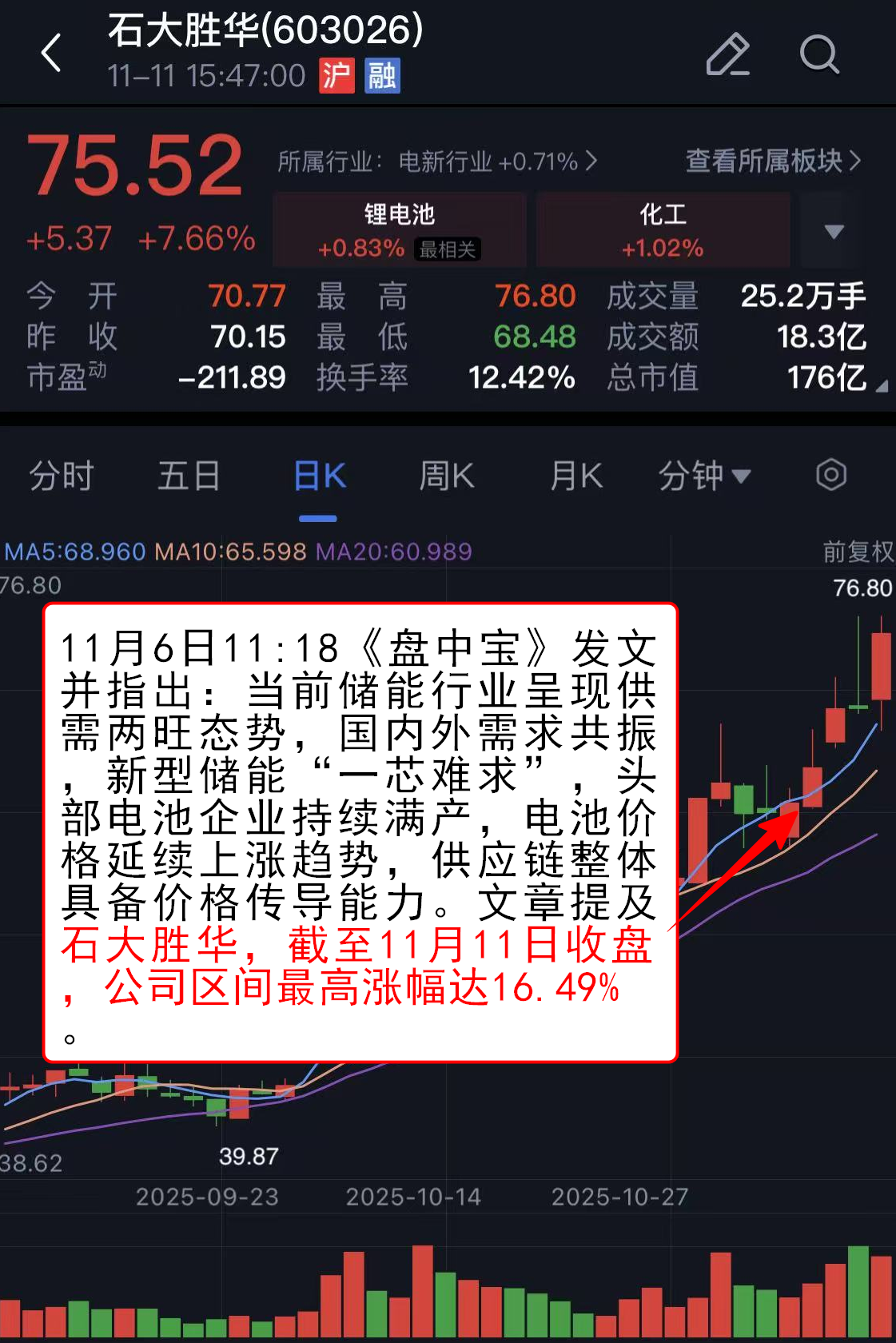 11月6日11:18《盘中宝》发文并指出:当前储能行业呈现供需两旺态势,国内外需求共振,新型储能“一芯难求”,头部电池企业持续满产,电池价格延续上涨趋势,供应链整体具备价格传导能力。文章提及石大胜华,截至11月11日收盘,公司区间最高涨幅达16.49%。