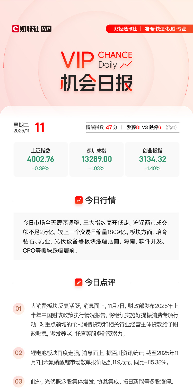 消息面上,11月7日,财政部发布2025年上半年中国财政政策执行情况报告,将继续实施好提振消费专项行动,对重点领域的个人消费贷款和相关行业经营主体贷款给予财政贴息,激发养老、托育等服务消费潜力。