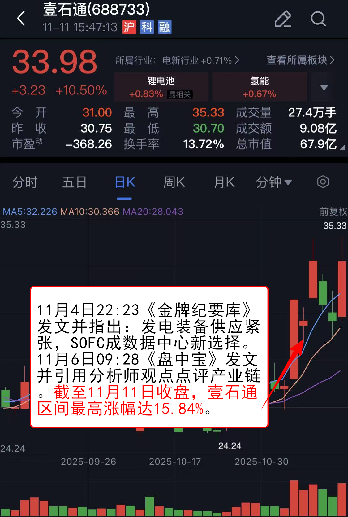 11月6日09:28《盘中宝》发文并引用分析师观点指出:AI电力需求大幅增长,SOFC具有广阔空间,产业链的公司或迎来发展契机。文章提及壹石通。