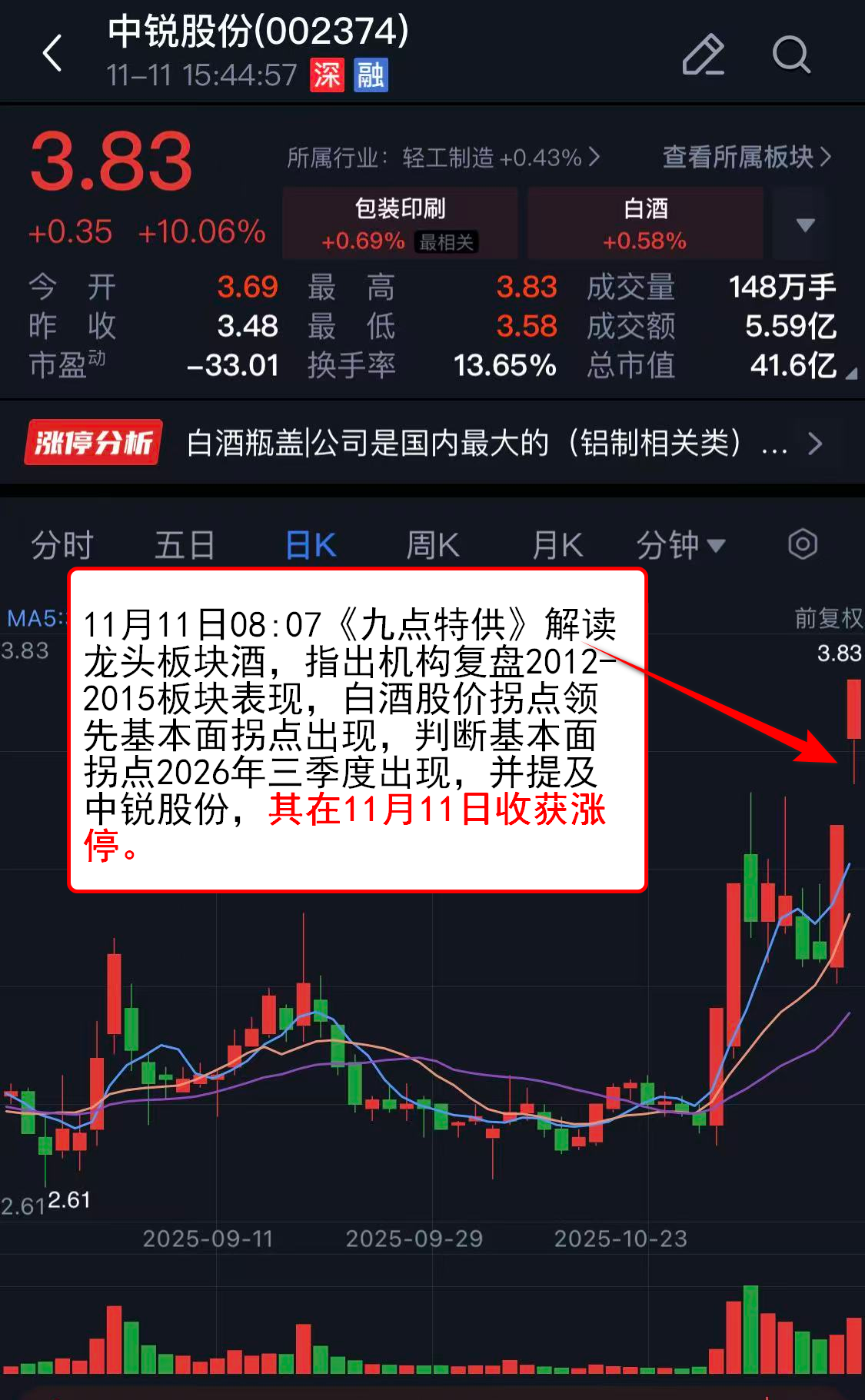 11月11日08:07《九点特供》解读龙头板块酒,指出机构复盘2012-2015板块表现,白酒股价拐点领先基本面拐点出现,判断基本面拐点2026年三季度出现,并提及中锐股份,其在11月11日收获涨停。