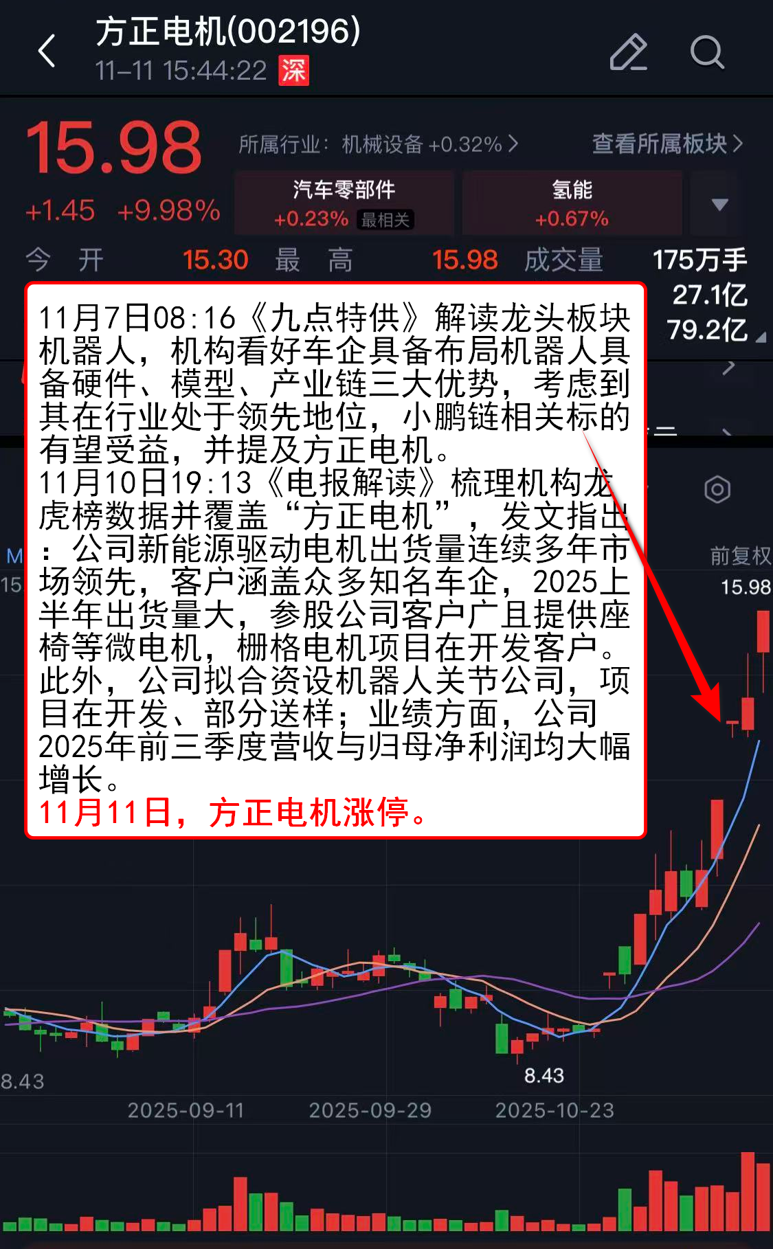 11月10日19:13《电报解读》梳理机构龙虎榜数据并覆盖“方正电机”,发文指出:公司新能源驱动电机出货量连续多年市场领先,客户涵盖众多知名车企,2025上半年出货量大,参股公司客户广且提供座椅等微电机,栅格电机项目在开发客户。此外,公司拟合资设机器人关节公司,项目在开发、部分送样;业绩方面,公司2025年前三季度营收与归母净利润均大幅增长。