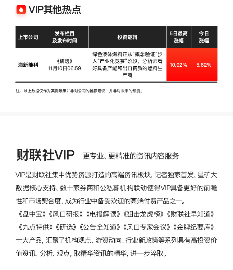 注:财联社VIP为内容资讯产品,并非投资建议。以下内容仅为资讯价值展示非对相关公司的推荐建议,非未来走势预测。投资有风险,入市需谨慎。