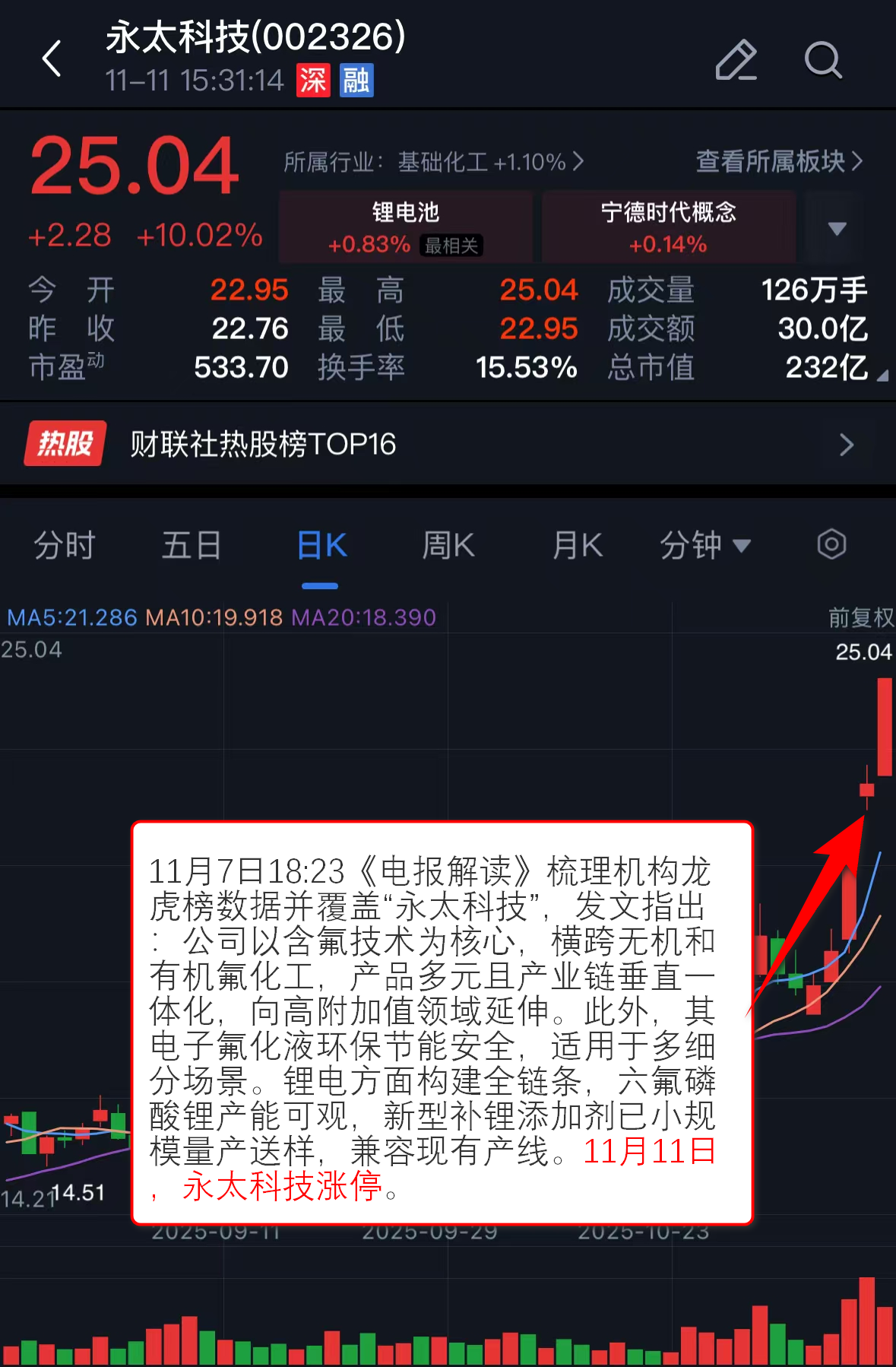 11月7日18:23《电报解读》梳理机构龙虎榜数据并覆盖“永太科技”,发文指出:公司以含氟技术为核心,横跨无机和有机氟化工,产品多元且产业链垂直一体化,向高附加值领域延伸。此外,其电子氟化液环保节能安全,适用于多细分场景。锂电方面构建全链条,六氟磷酸锂产能可观,新型补锂添加剂已小规模量产送样,兼容现有产线。11月11日,永太科技涨停。