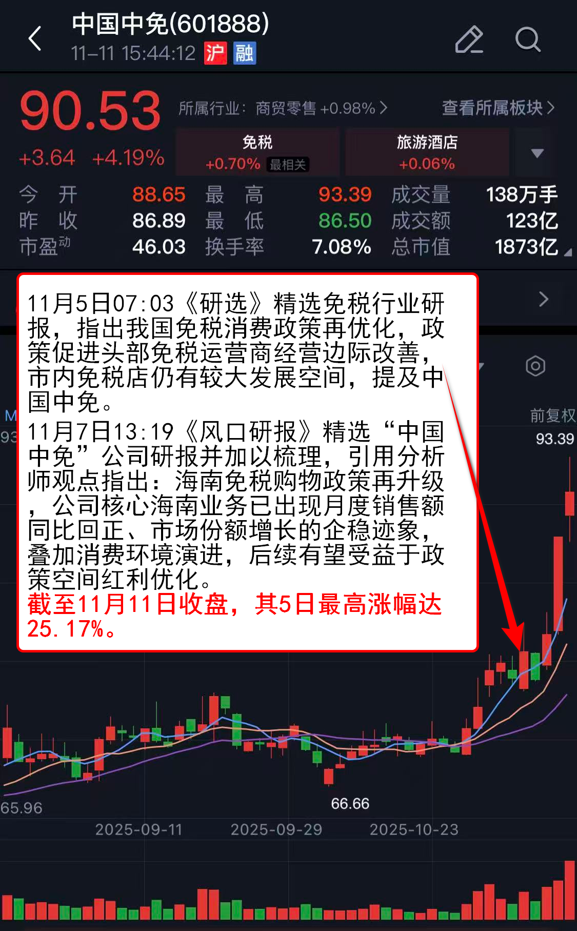 11月5日07:03《研选》精选免税行业研报,指出我国免税消费政策再优化,政策促进头部免税运营商经营边际改善,市内免税店仍有较大发展空间,提及中国中免。