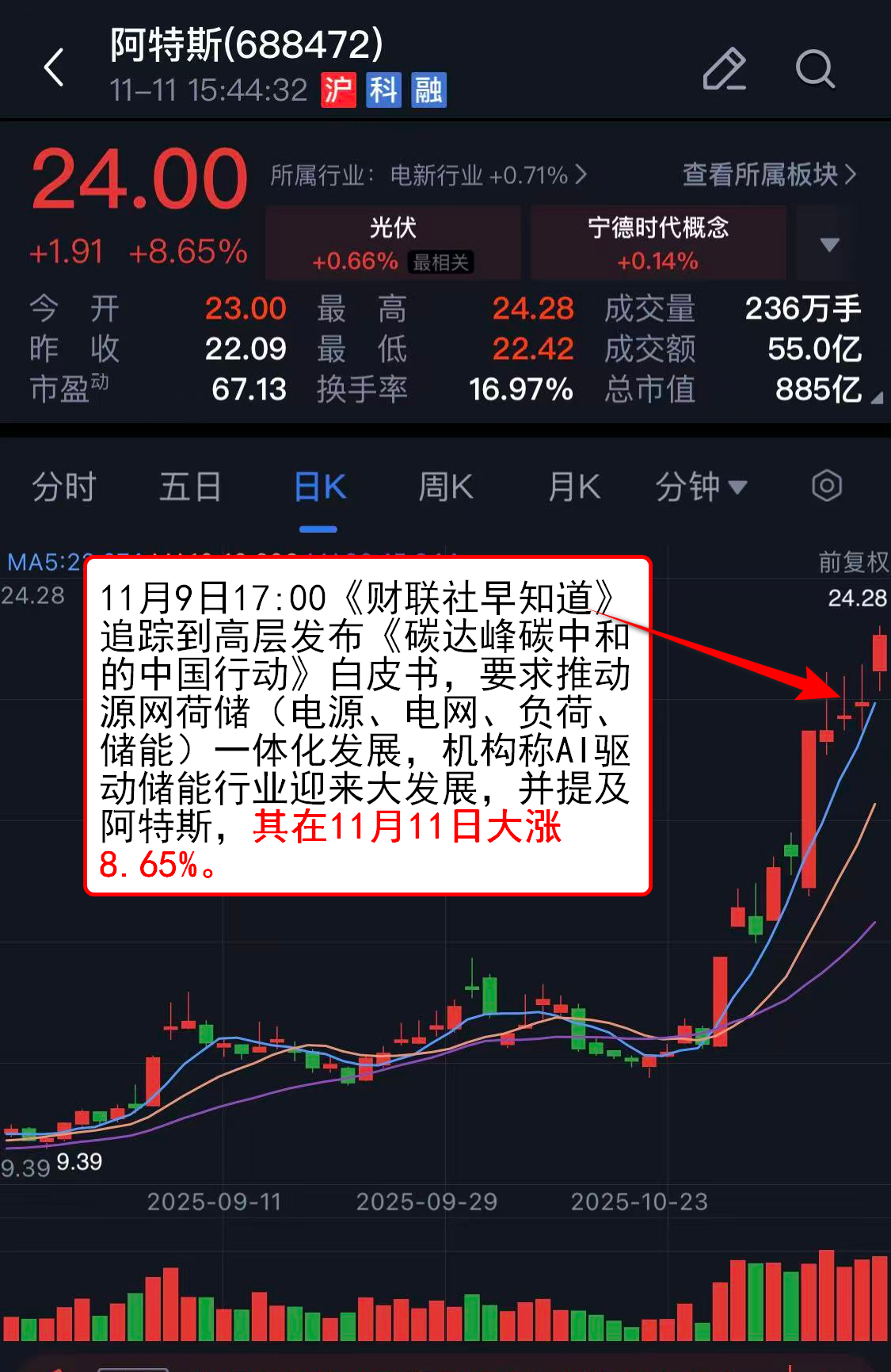 11月9日17:00《财联社早知道》追踪到高层发布《碳达峰碳中和的中国行动》白皮书,要求推动源网荷储(电源、电网、负荷、储能)一体化发展,机构称AI驱动储能行业迎来大发展,并提及阿特斯,其在11月11日大涨8.65%。