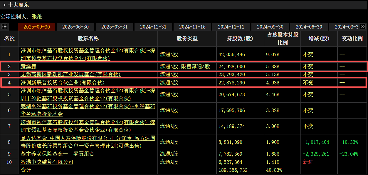 小财注:截至三季度末,深圳新联普为香农芯创第四大股东,持股2287.83万股,占公司总股本的4.93%。深圳新联普一致行动人兼公司董事长黄泽伟位列公司第二大股东,持股2492.8万股,占公司总股本的5.38%。