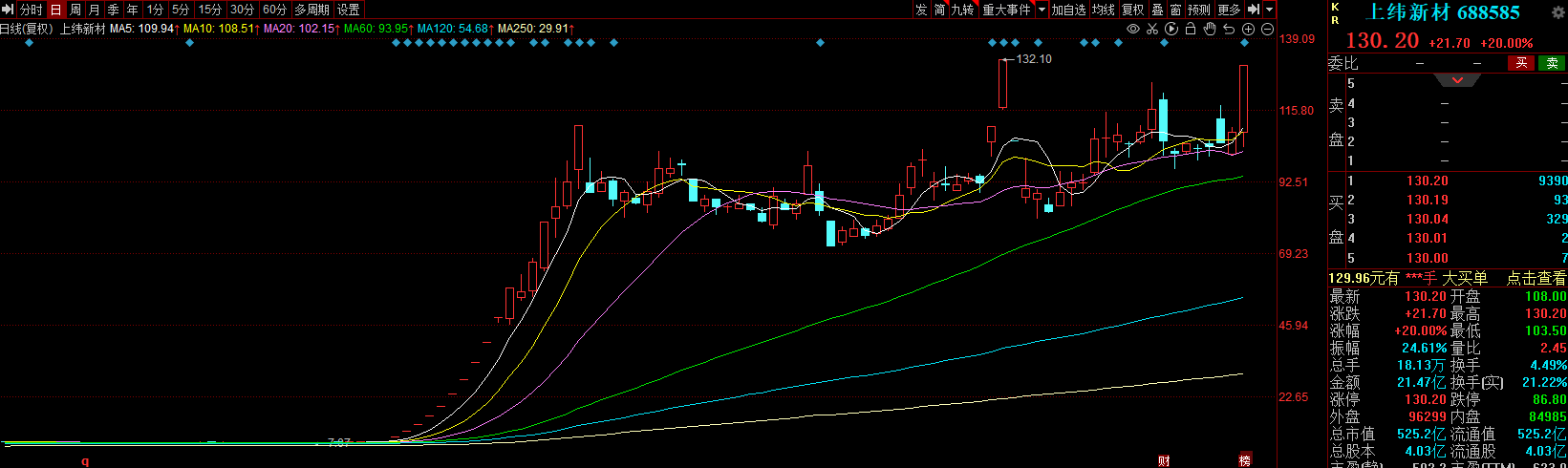 受上纬新材官宣开展机器人业务的影响,公司股价午后大幅拉升走强并涨停,截至收盘,该股股价已逼近历史新高,报收130.20元/股,公司总市值达525.2亿元。