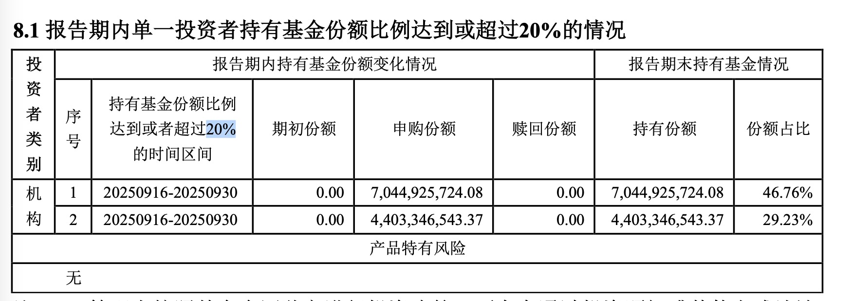 三季报显示,该基金在今年三季度获得了两位大客户的申购。其中一位大客户的申购份额达70.45亿份,另一位大客户的申购份额达44.03亿份。