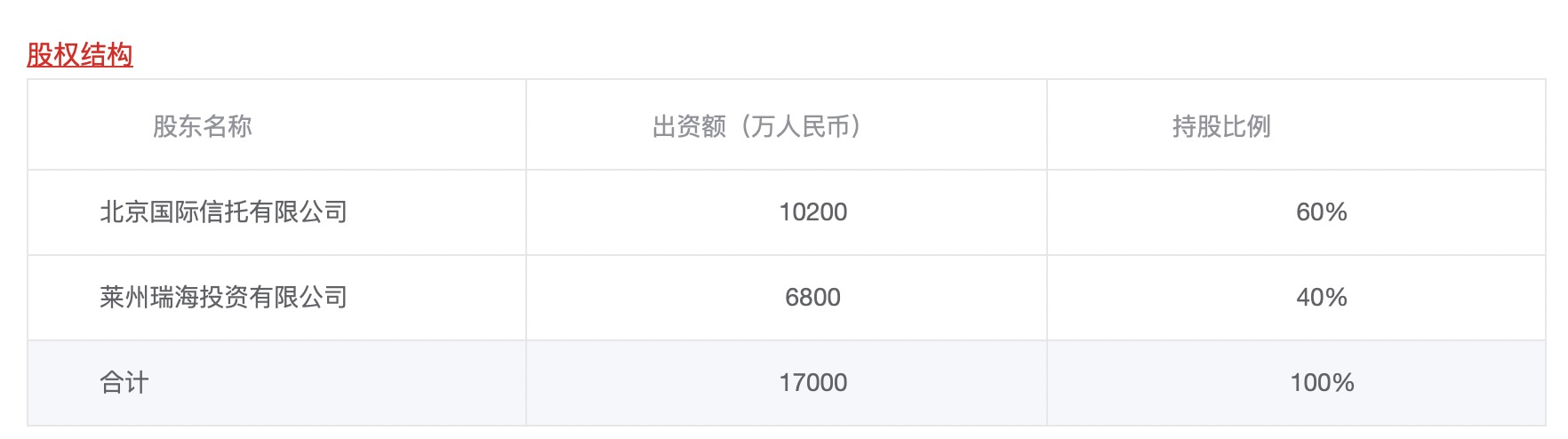 目前北京国际信托有限公司对北信瑞丰基金的持股比例为60%,莱州瑞海投资有限公司对北信瑞丰基金的持股比例为40%。