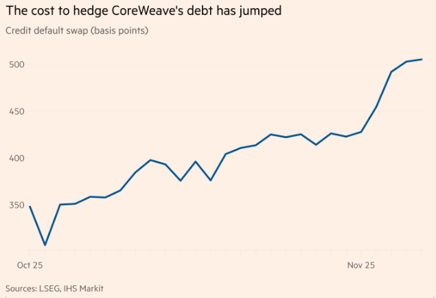 随着股价下跌,防范CoreWeave债务违约的成本急剧攀升——LSEG的数据显示,CoreWeave五年期信用违约掉期(CBS)交易价格已从10月初的不到350个基点升至505个基点。