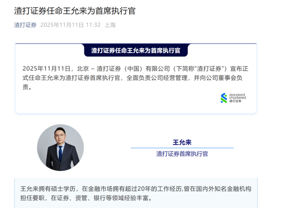 渣打证券(中国)通过官方公众号宣布正式任命王允来为渣打证券首席执行官,全面负责公司经营管理,并向公司董事会负责。