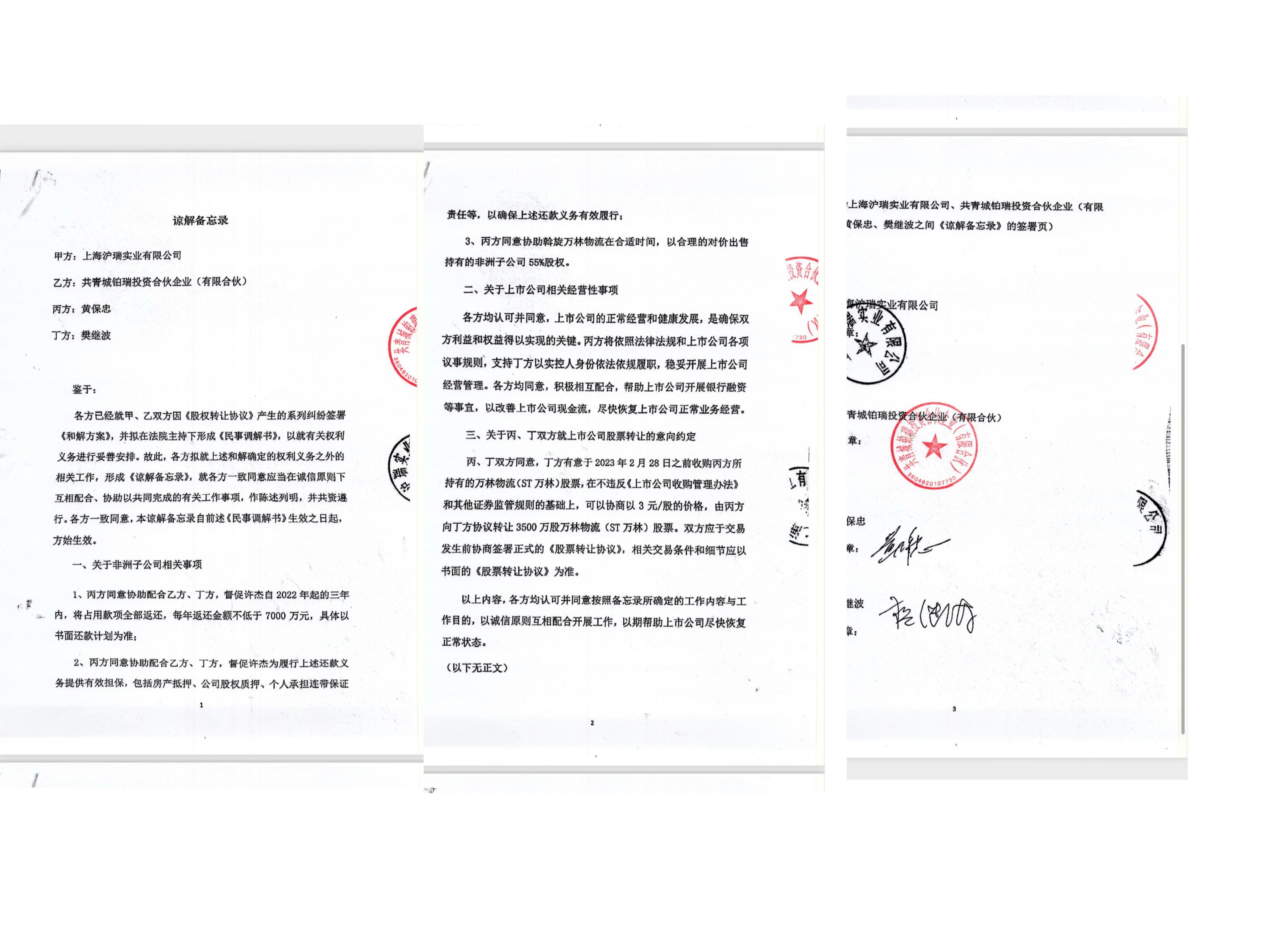 事实上,2022年黄保忠起诉冻结樊继波名下股权后,双方曾签订《谅解备忘录》,对裕林国际相关方返还占用款项、上市公司出售持股以及各方协助上市公司开展融资等事宜,已作出相关约定。