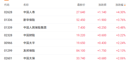 截至收盘,中国人寿(保险股02628.HK)涨4.30%、新华保险(01336.HK)涨3.76%、中国人民保险集团(01339.HK)涨3.48%。