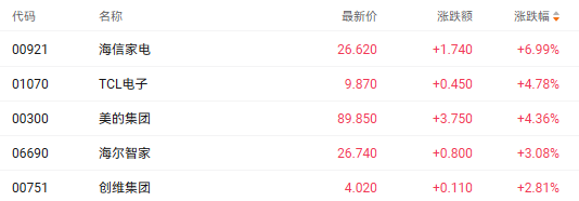截至收盘,海信家电(00921.HK)涨6.99%、TCL电子(01070.HK)涨4.78%、美的集团(00300.HK)涨4.36%。