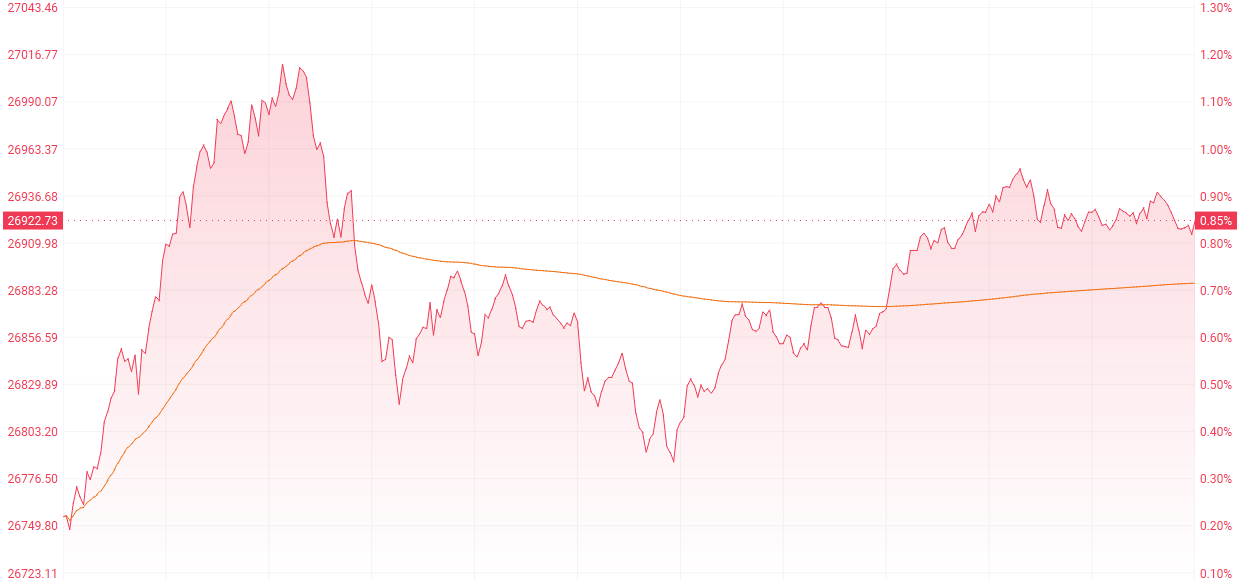 财联社11月12日讯(编辑 胡家荣)港股三大指数集体收涨。截至收盘,恒生指数涨0.85%,报26922.73点;科技指数涨0.16%,报5933.99点;国企指数涨0.82%,报9538.99点。