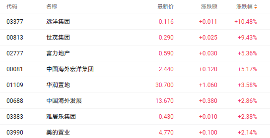 截至收盘,远洋集团(03377.HK)涨10.48%、世茂集团(00813.HK)涨9.43%、中国海外宏洋集团(00081.HK)涨5.17%。