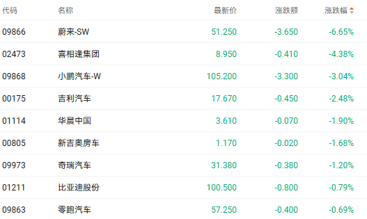 截至收盘,蔚来-SW(09866.HK)跌6.65%、小鹏汽车-W(09868.HK)跌3.04%、吉利汽车(00175.HK)跌2.48%。