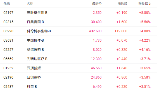 截至收盘,三叶草生物-B(02197.HK)涨8.80%、百奥赛图-B(02315.HK)涨5.56%、科伦博泰生物-B(06990.HK)涨4.80%。