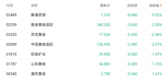 截至收盘,紫金黄金国际(02259.HK)跌2.50%、灵宝黄金(03330.HK)跌2.46%、中国黄金国际(02099.HK)跌2.07%。
