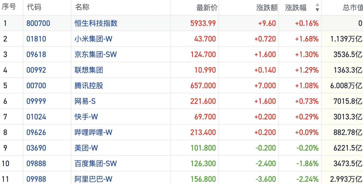 盘面上,今日大型科网股继续分化,小米涨1.68%,京东涨1.3%,腾讯涨1%,阿里巴巴跌超2%,百度跌1.86%,美团微幅走低。