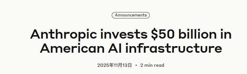 财联社11月13日讯(编辑 赵昊)美国人工智能(AI)初创企业Anthropic宣布,公司计划投资500亿美元用于建设美国人工智能基础设施,首批项目为在得州和纽约州建立定制化数据中心。